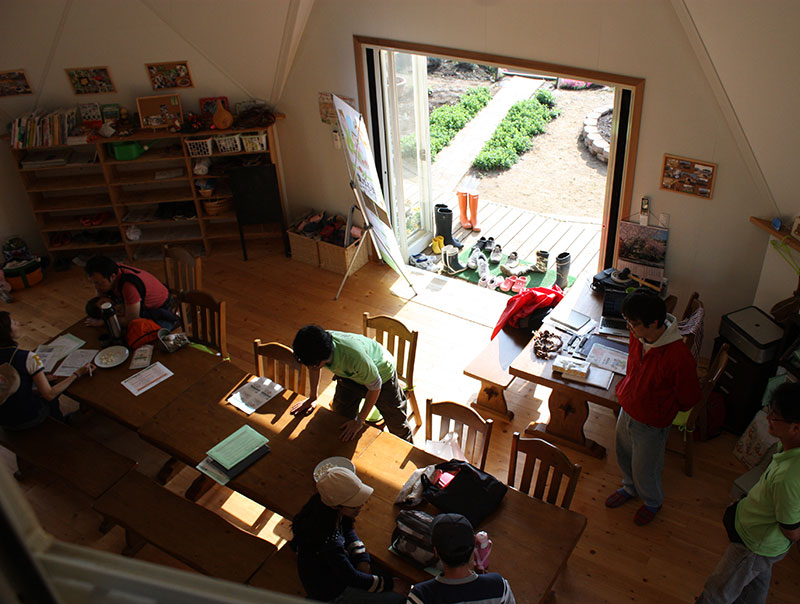 農作業のあと、ドームハウスで元気に遊ぶ子供たち。