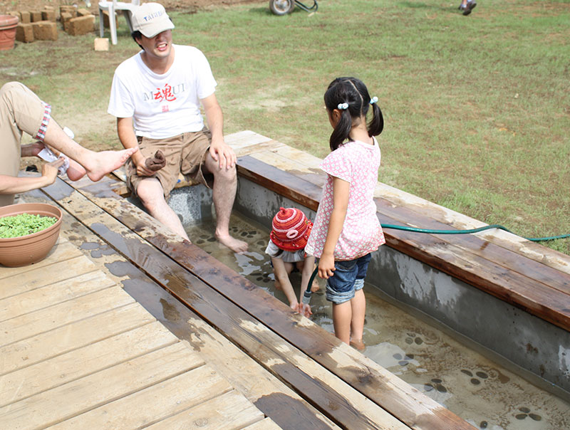 畑で泥んこになった後は自然の中の足湯でゆっくり癒しの時間を。